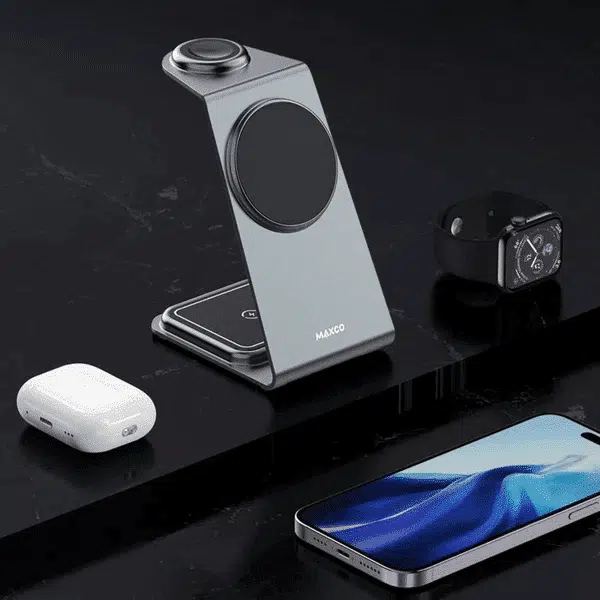 Transform your charging experience with the Maxco MW05 3-in-1 Multi-Function Wireless Charger. This sleek and stylish charger not only simplifies your charging needs but also enhances your space with its modern gray design. Whether it’s your smartphone, smartwatch, or earbuds, the Maxco MW05 has got you covered.