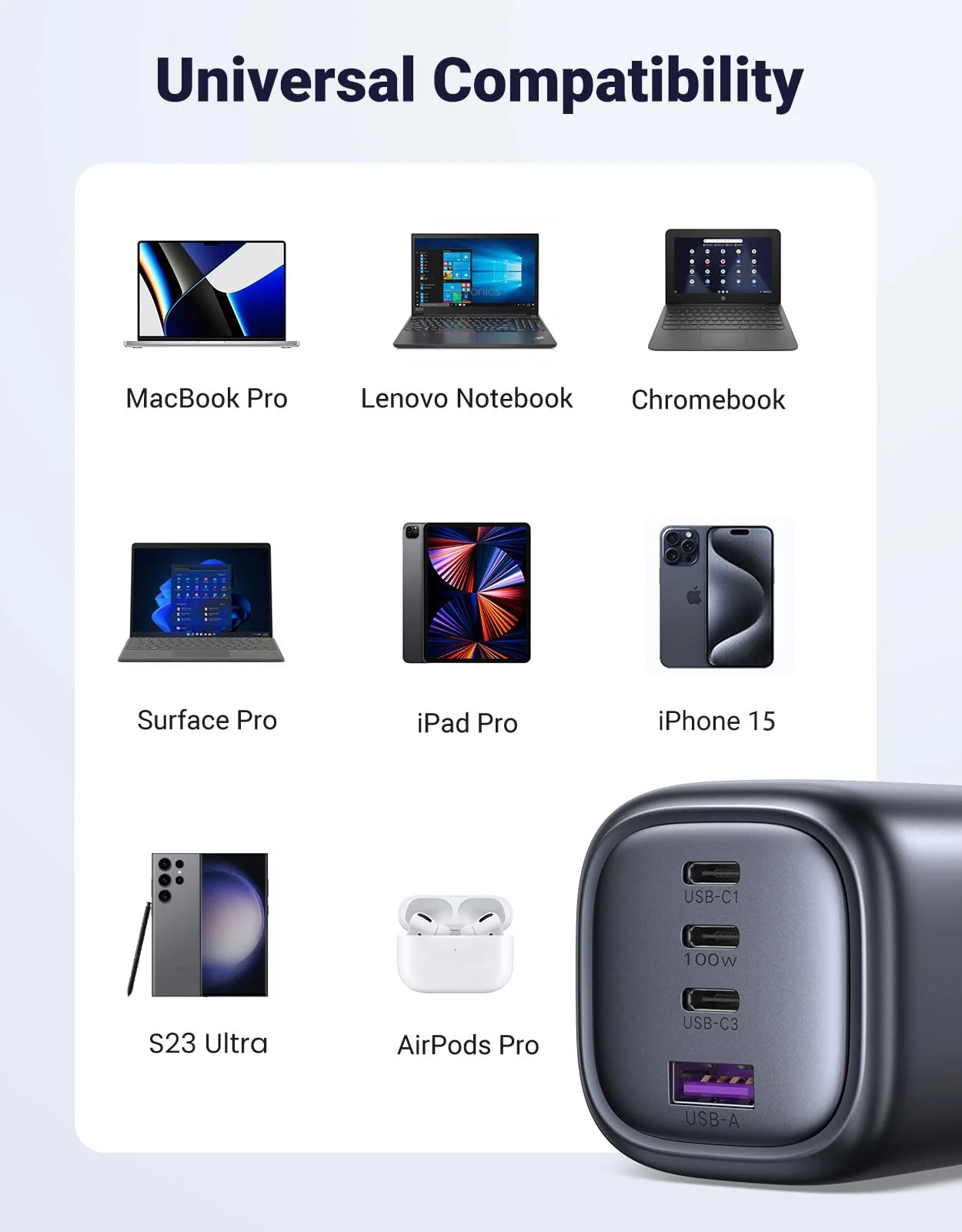 Powerful GaN Technology: Efficiently delivers up to 100W of power, ensuring rapid charging.